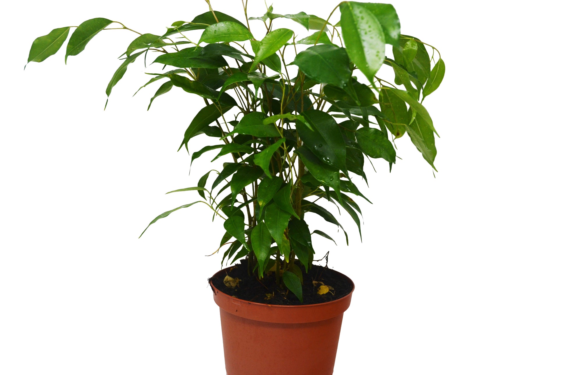 - Description: Native to Asia and Australia, Ficus 'Benjamina' with gracefully drooping branchlets and glossy leaves with a splash of yellow and is a popular houseplant for its ease of care and elegant growth. Although the Ficus plant grows naturally in lowland tropical forests, it can thrive in a large range of environments. In its natural habitat, this ficus grows to a large and stately tree up to 100ft tall, so indoor growing may require pruning. Although it was determined that Ficus benjamina is effective at removing common household air toxins formaldehyde and xylene, it is also a source of allergies, especially for people allergic to latex. Not recommended for pet owners.