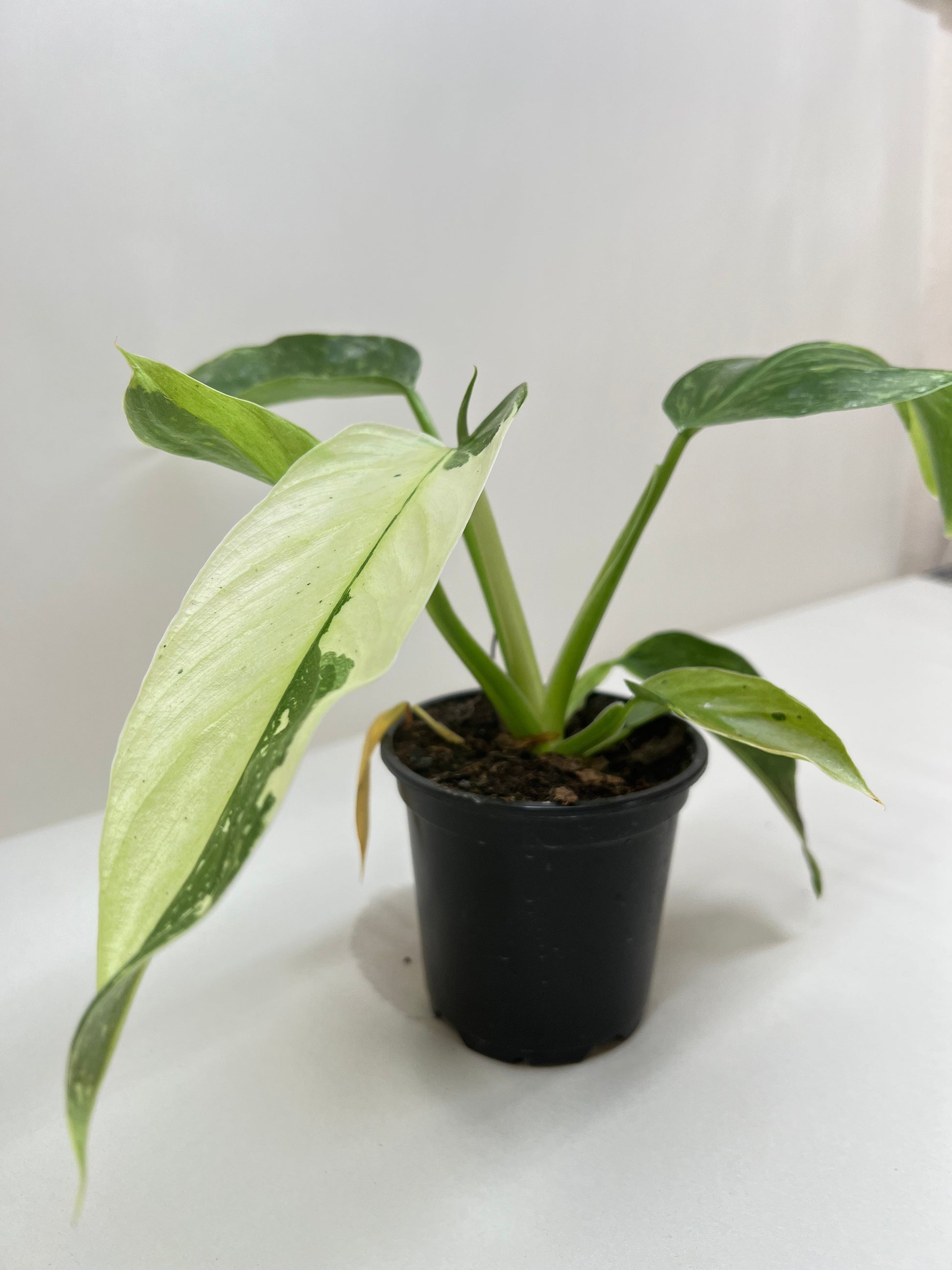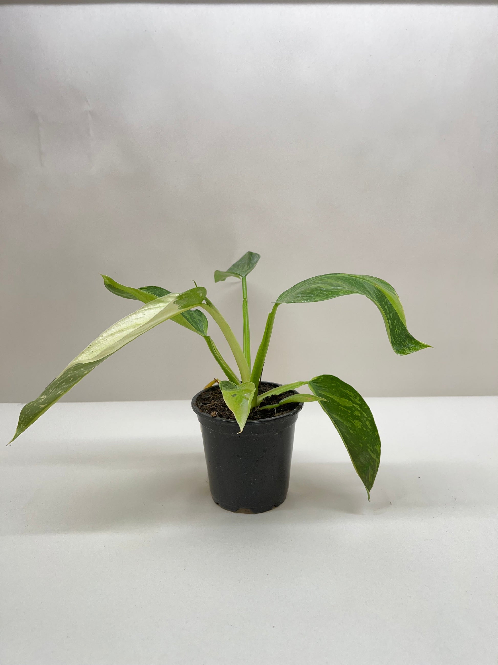 - Description: A Philodendron Jose Buono is a striking variety of philodendron known for its large, glossy leaves with vibrant white or cream variegation, appearing as splashes and patches across the leaf.